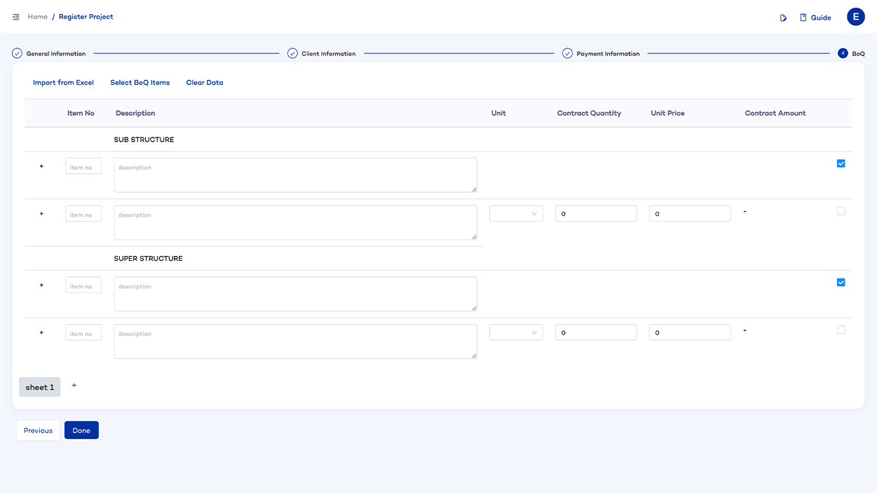 Either import or manually register bill of quantities of the project specifying the tasks to be carried out with their unit, quantity, unit price, and total amount.