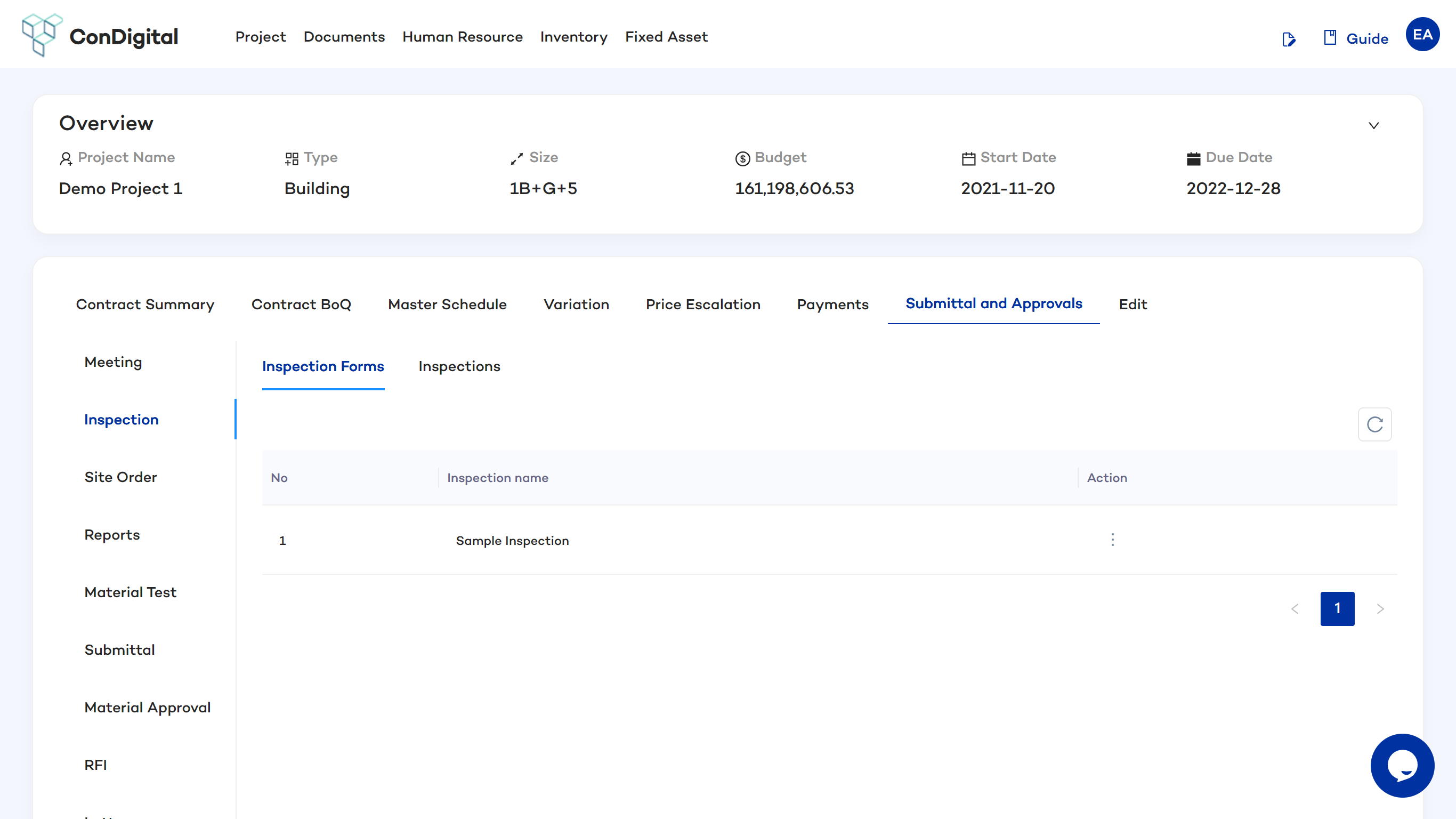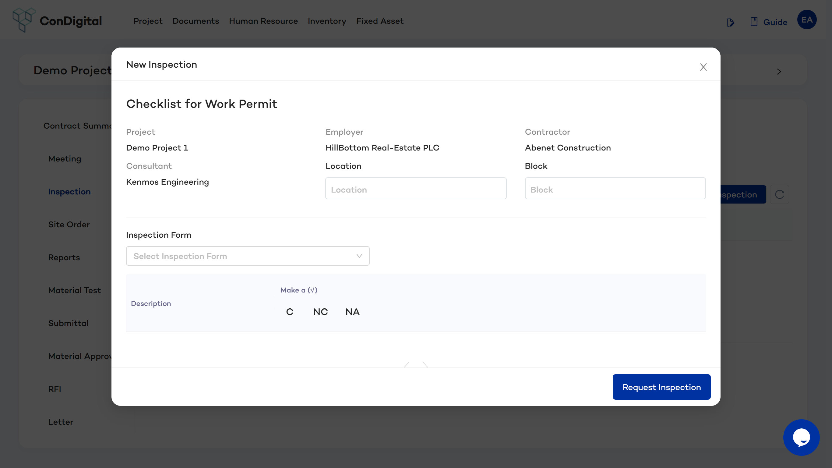 Go to Inspection under the submittals section and proceed to click the button Request Inspection and request an inspection by choosing which inspection you require for the work permit.