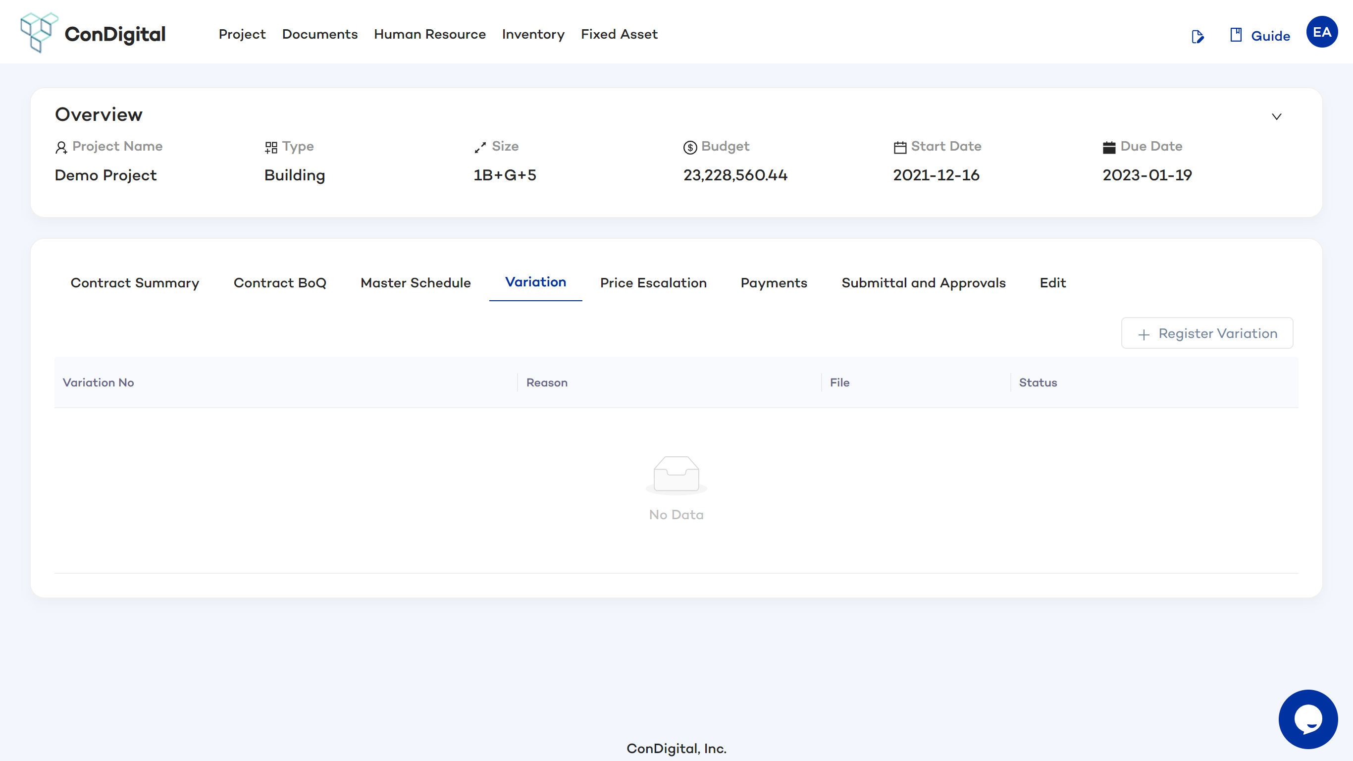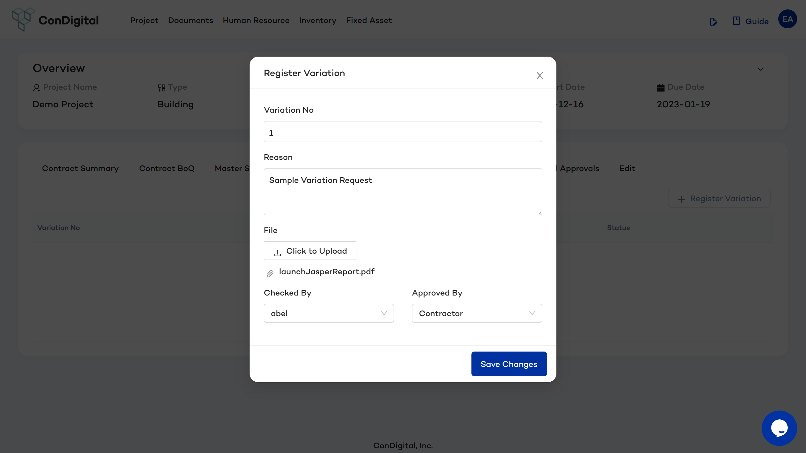 On the variation request, you can register variation by stating the amount and the reason for the variation request.